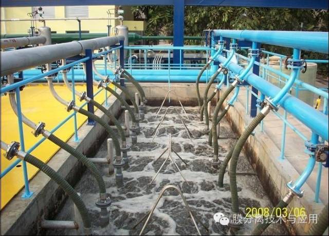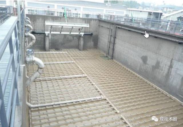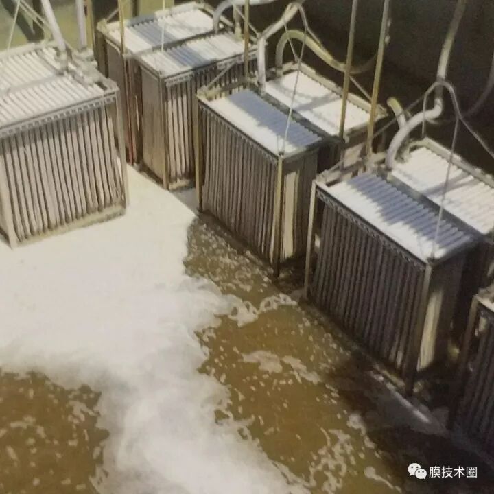A(2A)O-MBR工藝是兩段缺氧A2O工藝與MBR工藝的結(jié)合,其特點(diǎn)是在傳統(tǒng)的A2O工藝中設(shè)置了兩段缺氧區(qū)(缺氧區(qū)Ⅰ和缺氧區(qū)Ⅱ),在第一缺氧區(qū)內(nèi)從好氧區(qū)回流的NO3-完全被還原,實現(xiàn)完全反硝化;而在第二缺氧區(qū)內(nèi)實現(xiàn)內(nèi)源反硝化,節(jié)省外加碳源的投加,則可大大提高污水的生物脫氮效率,同時避免了外加碳源,節(jié)約運(yùn)行費(fèi)用,因此具有很高的價值,下圖為在MBR膜池內(nèi)的高抗污染FR-MBR膜組件。